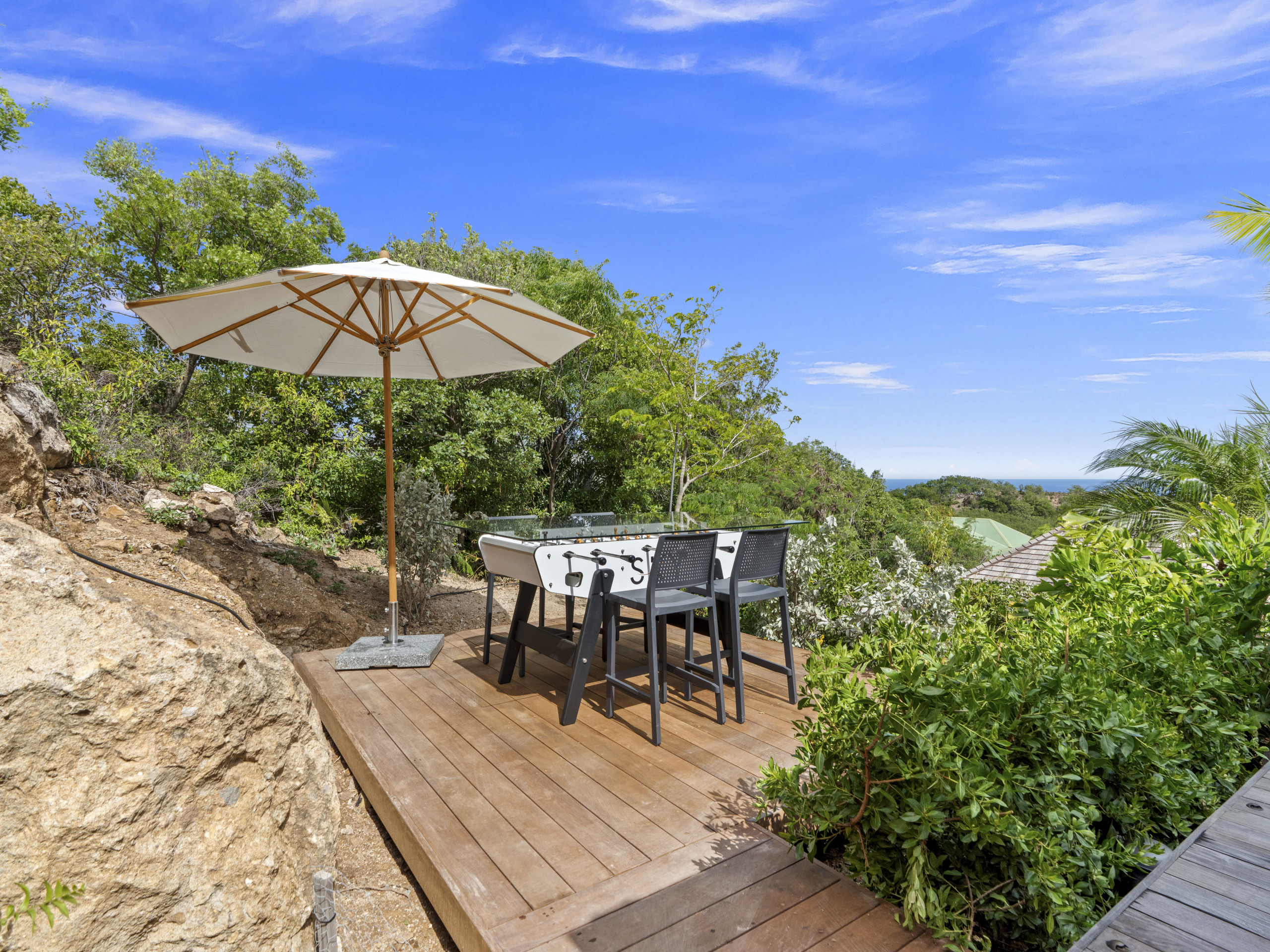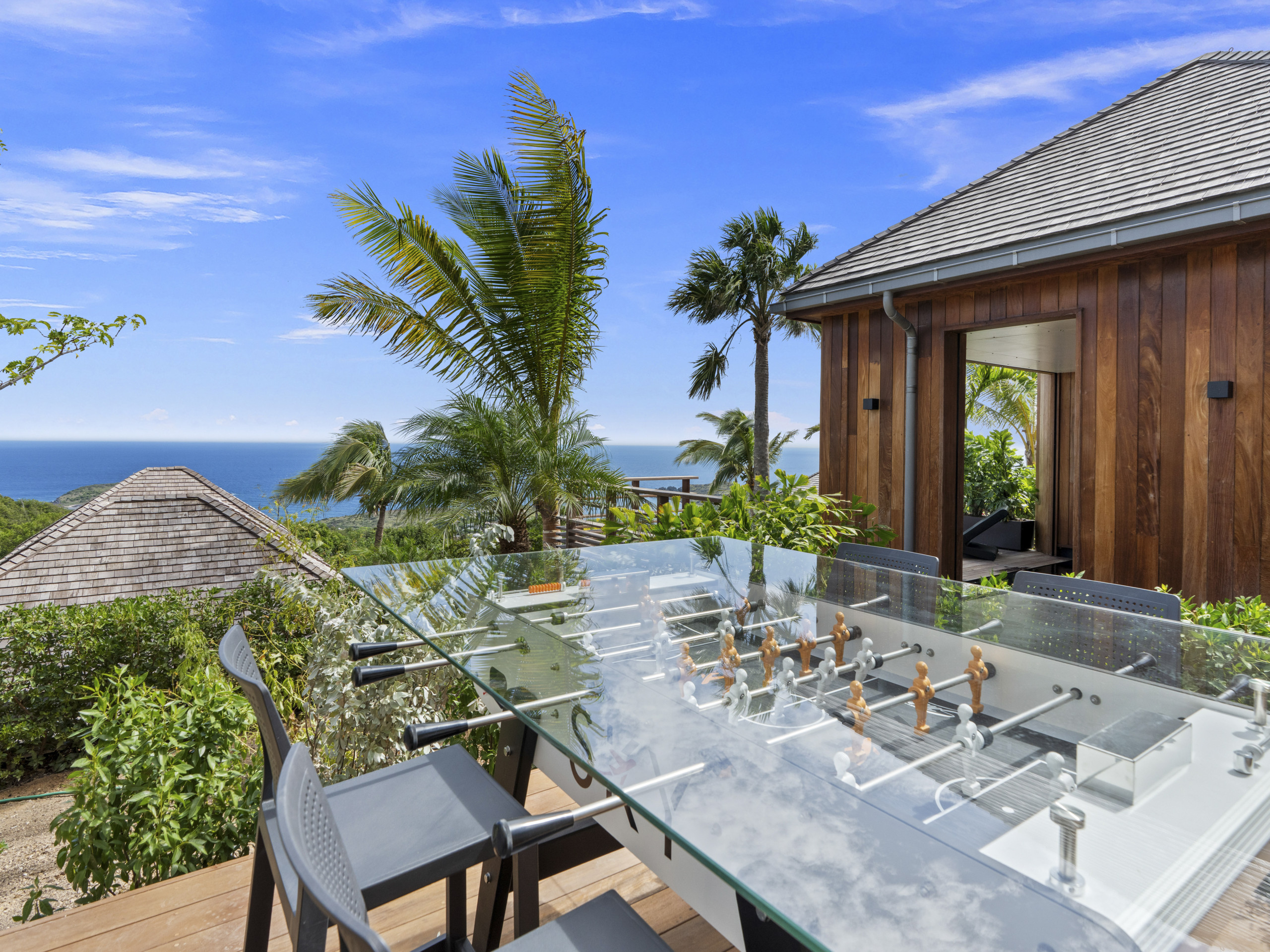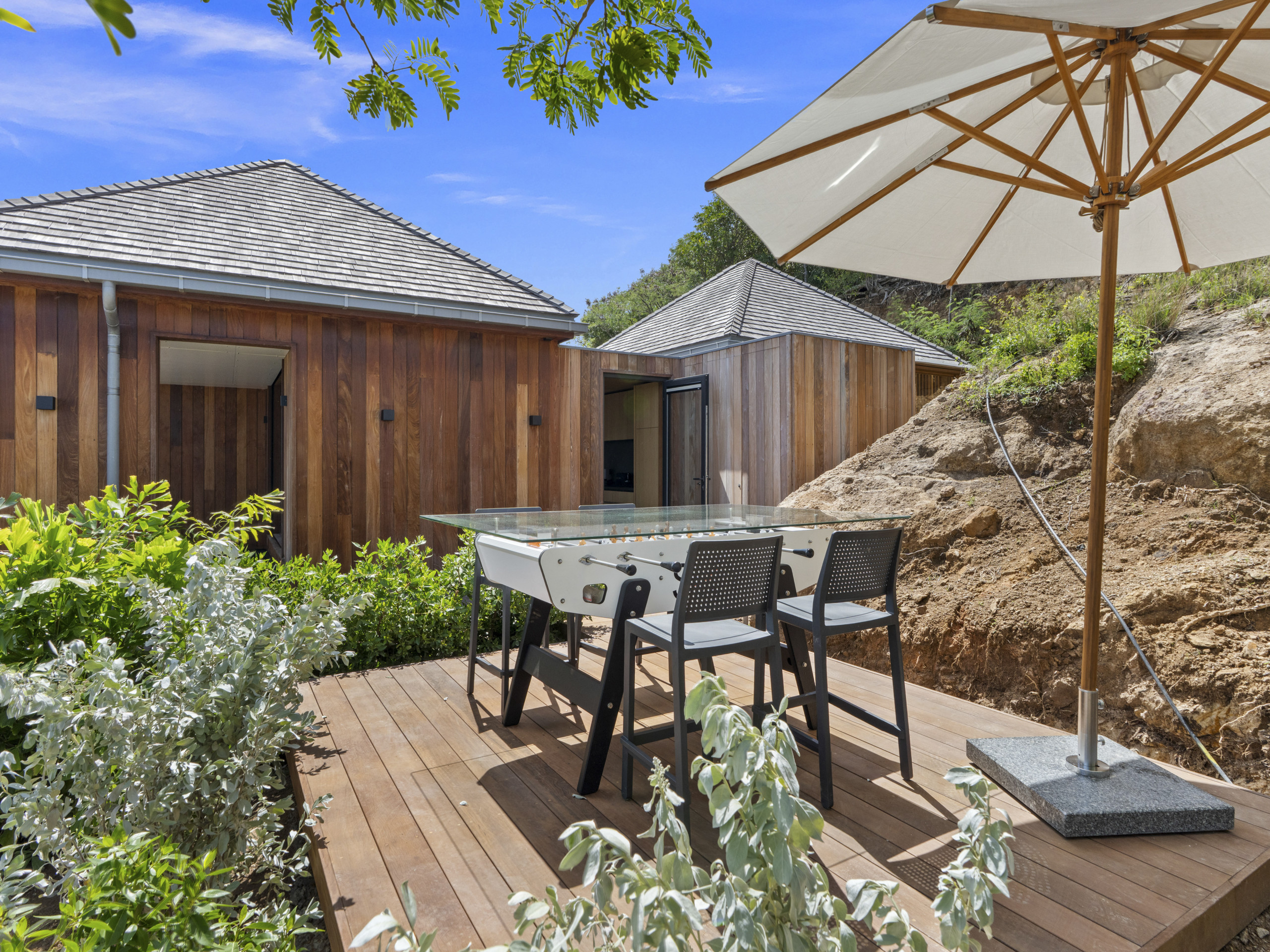 Terrasse privée avec transats, repas en plein air et baby-foot pour des fins de journée en douceur