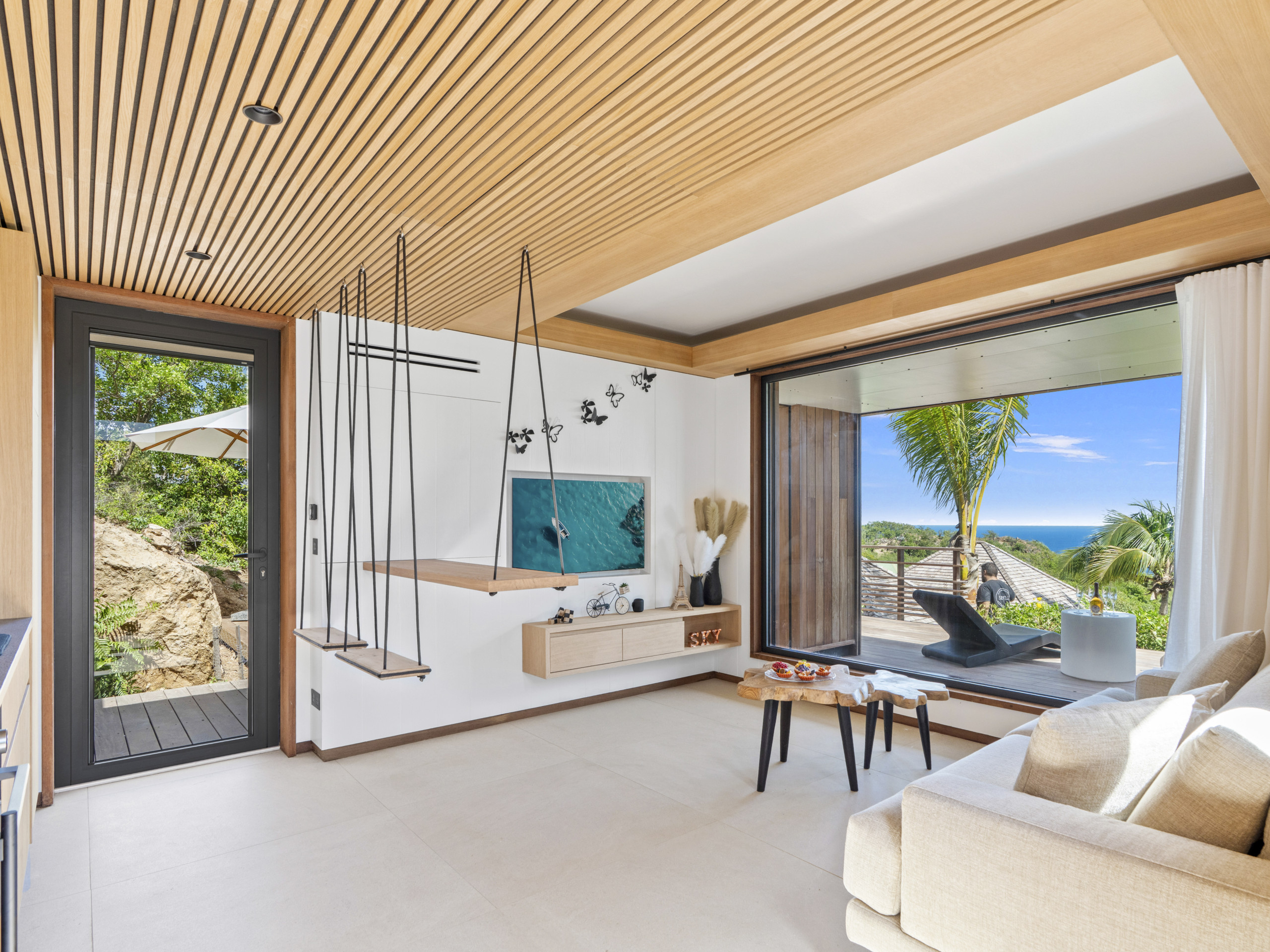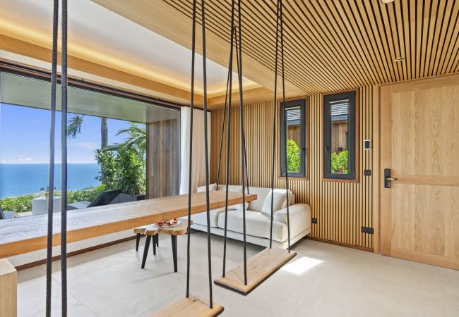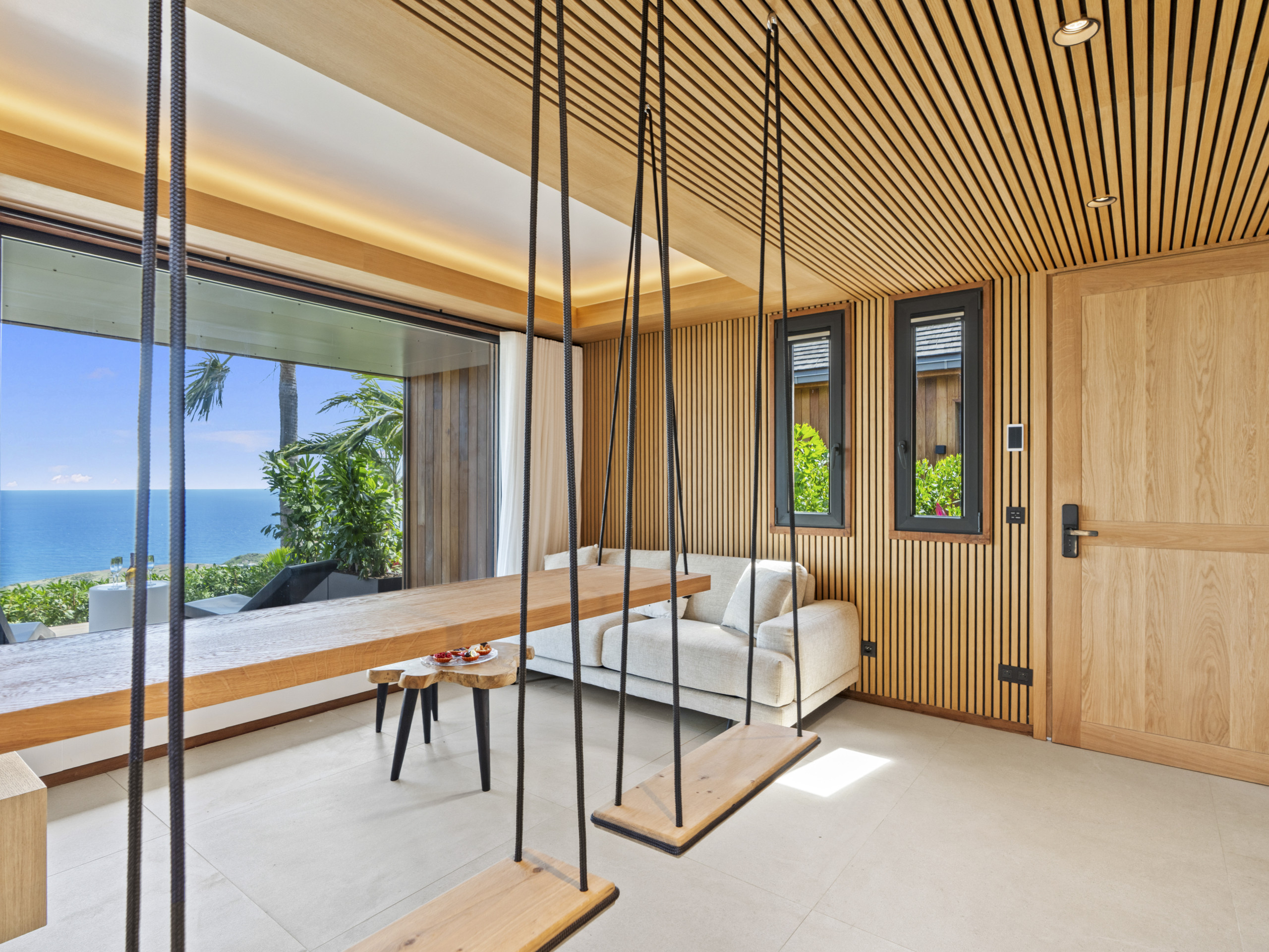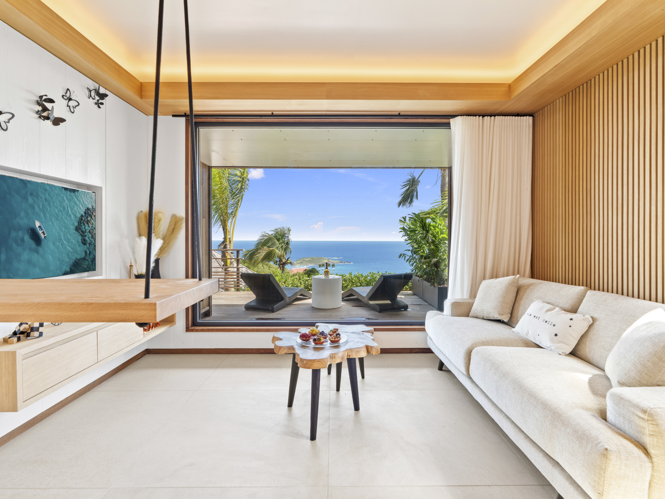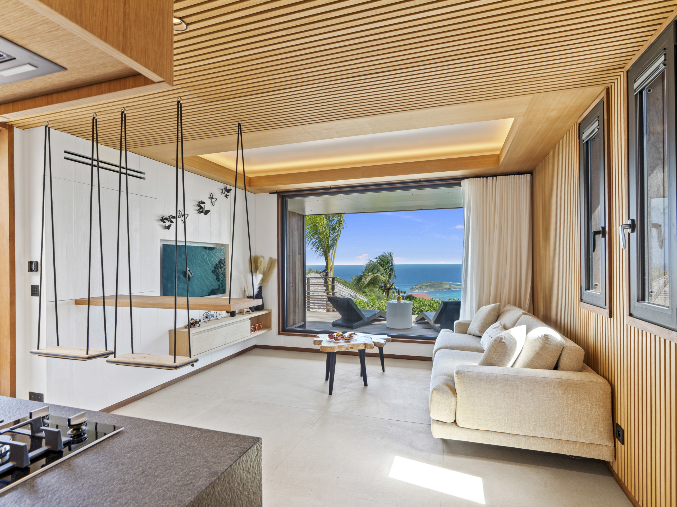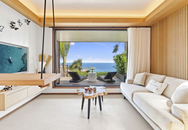 Salon lumineux ouvert sur la terrasse, baie panoramique cadrant l’océan