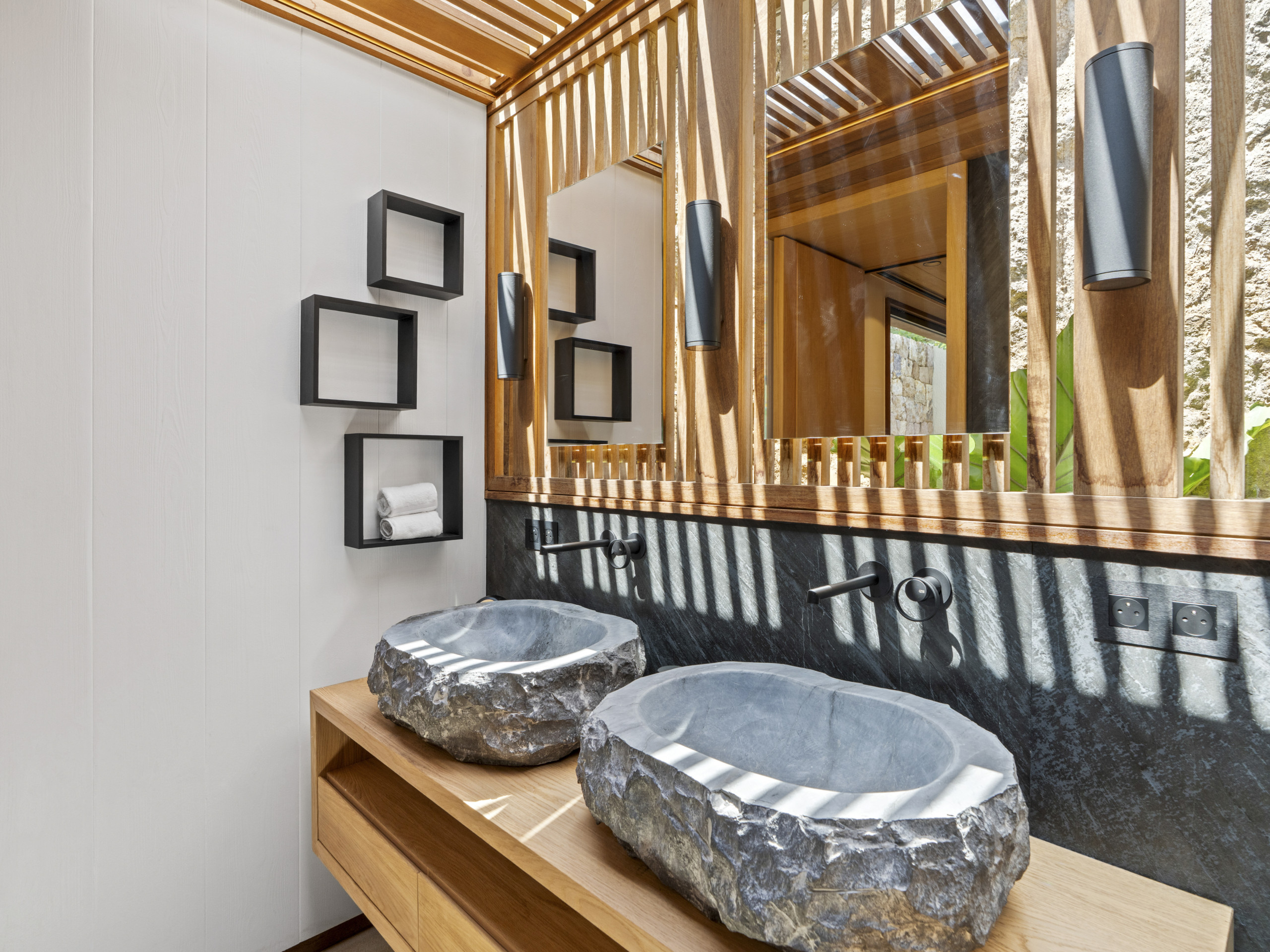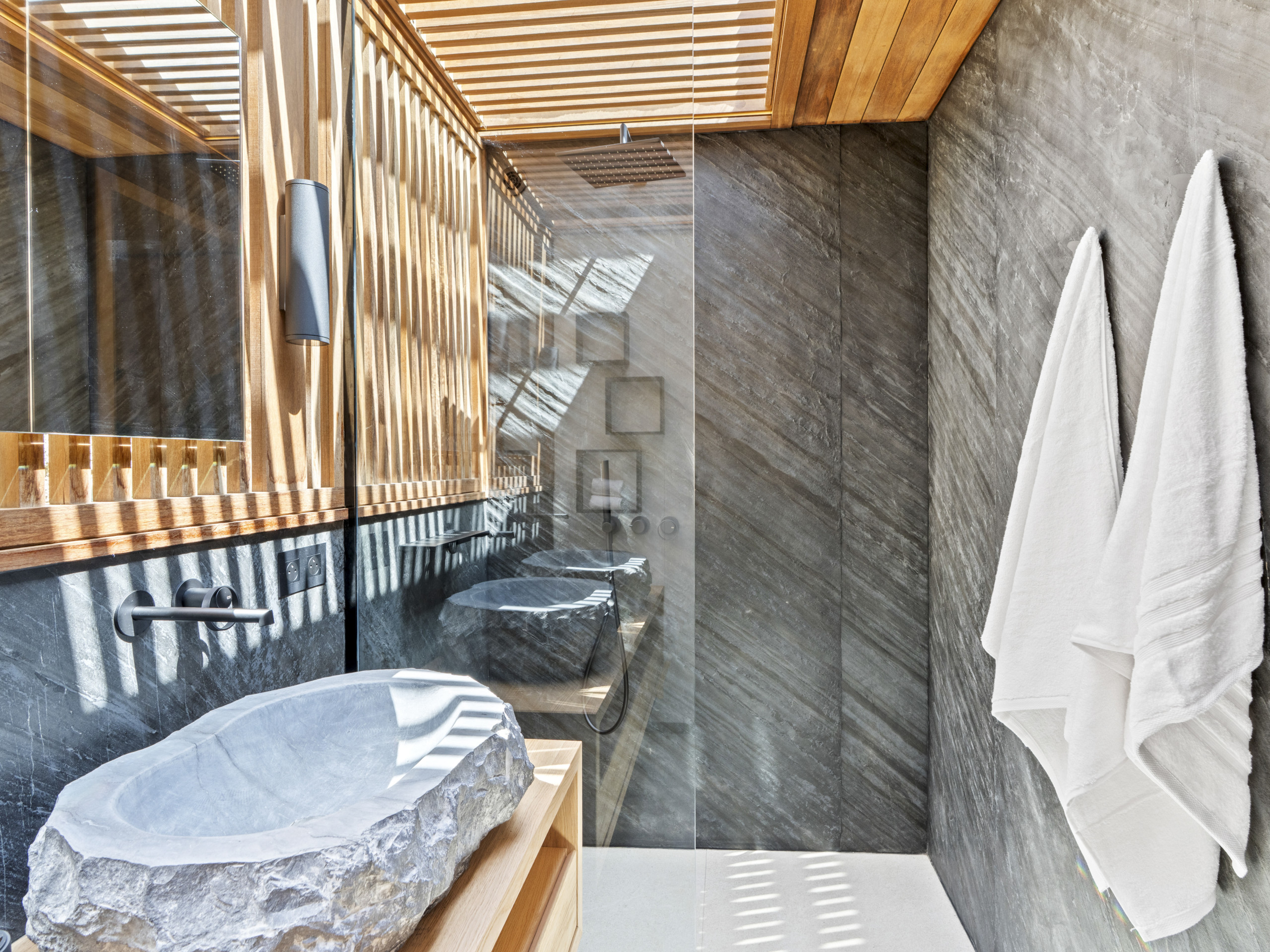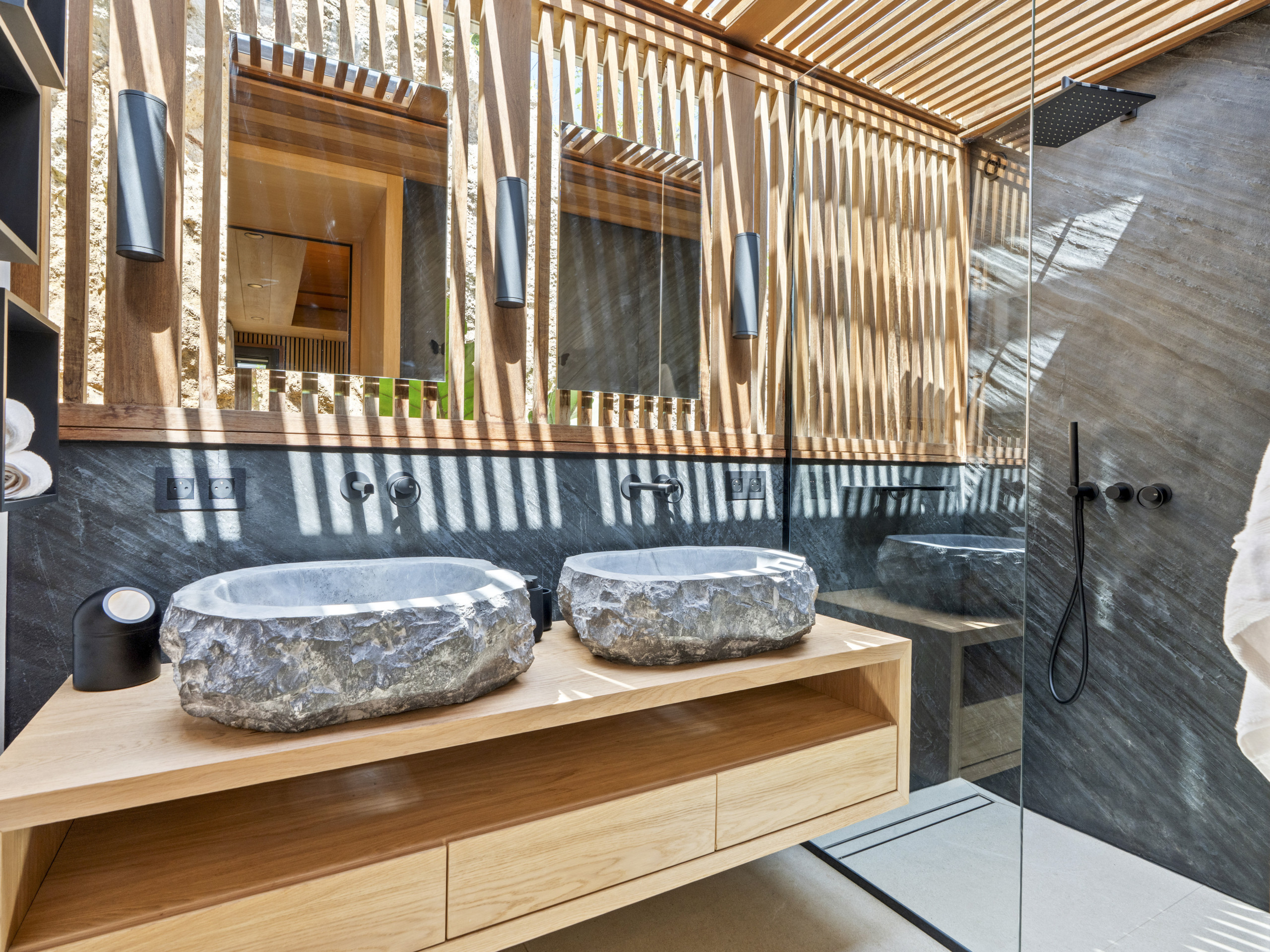 Salle de bain contemporaine (doubles vasques effet pierre, douche à l’italienne)