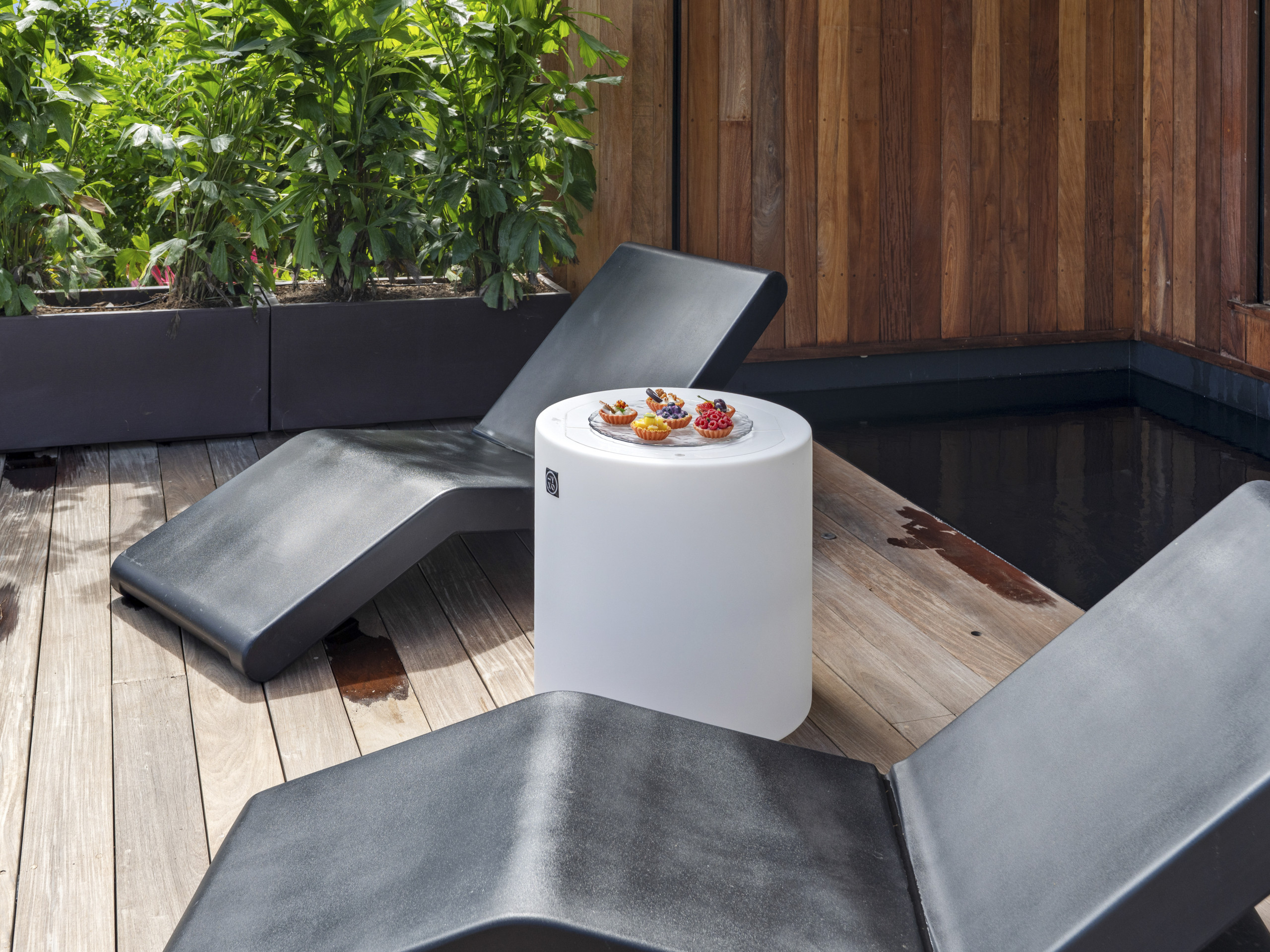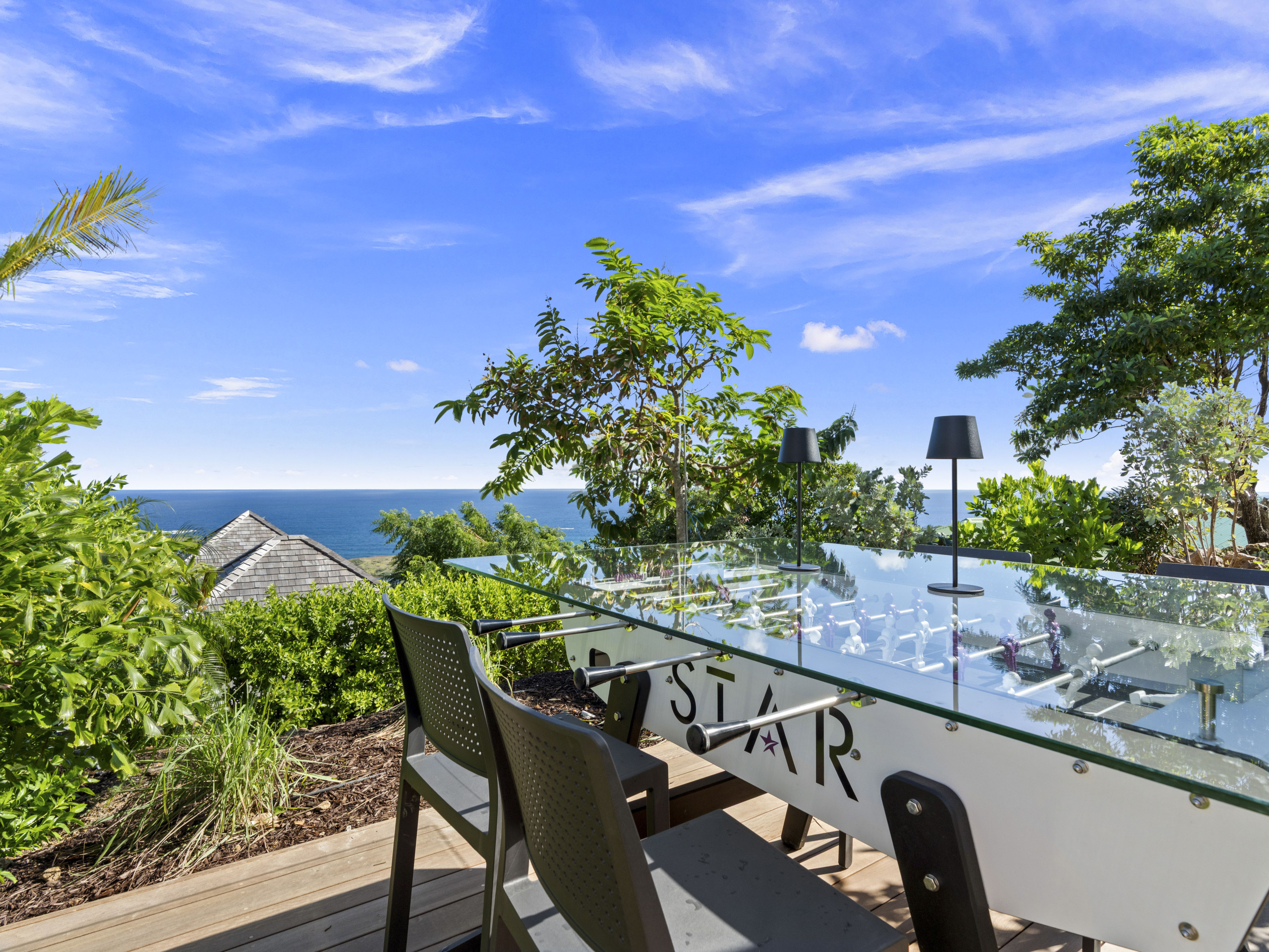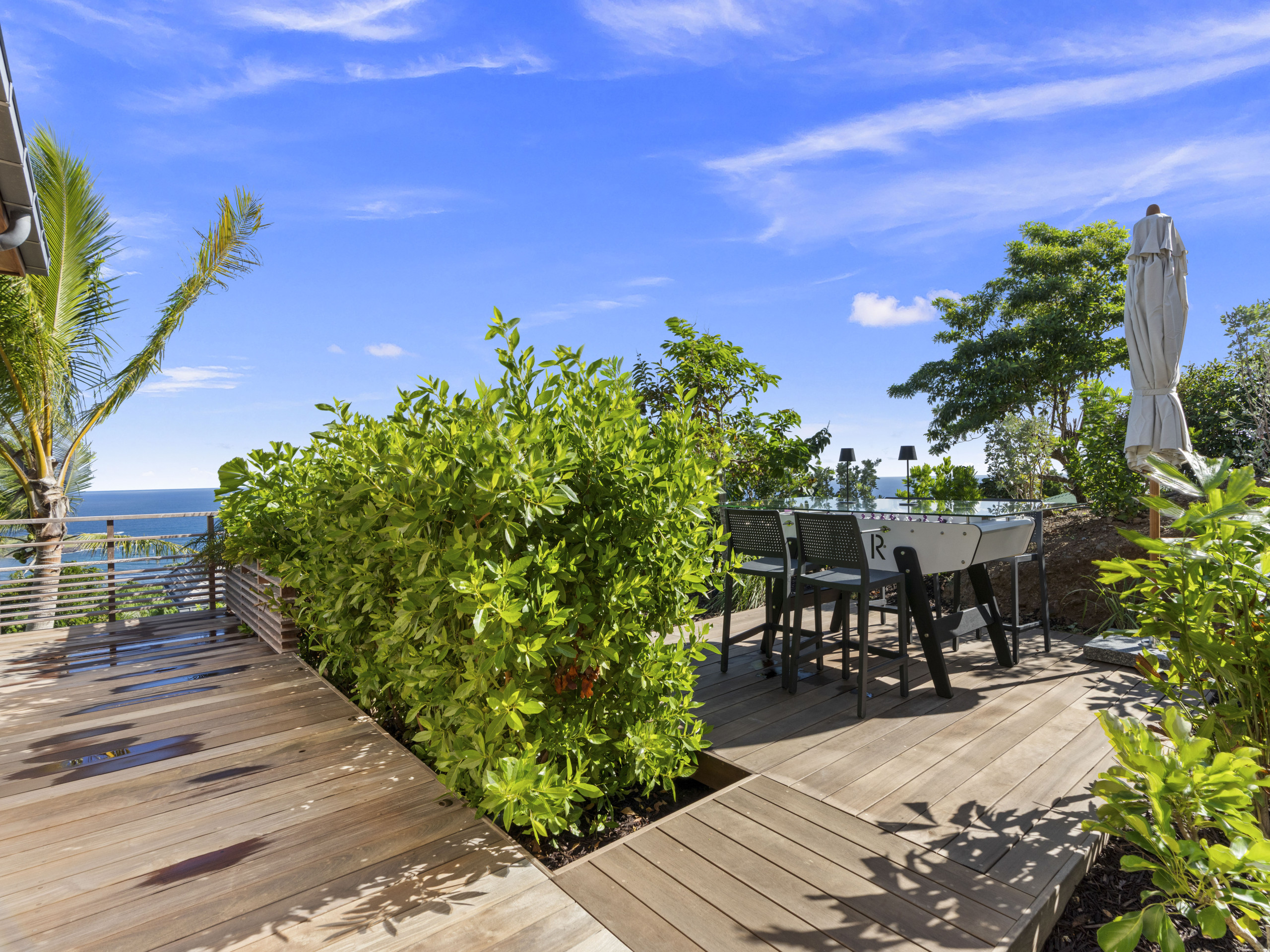Terrasse privée avec transats, repas en plein air et baby-foot pour des fins de journée en douceur