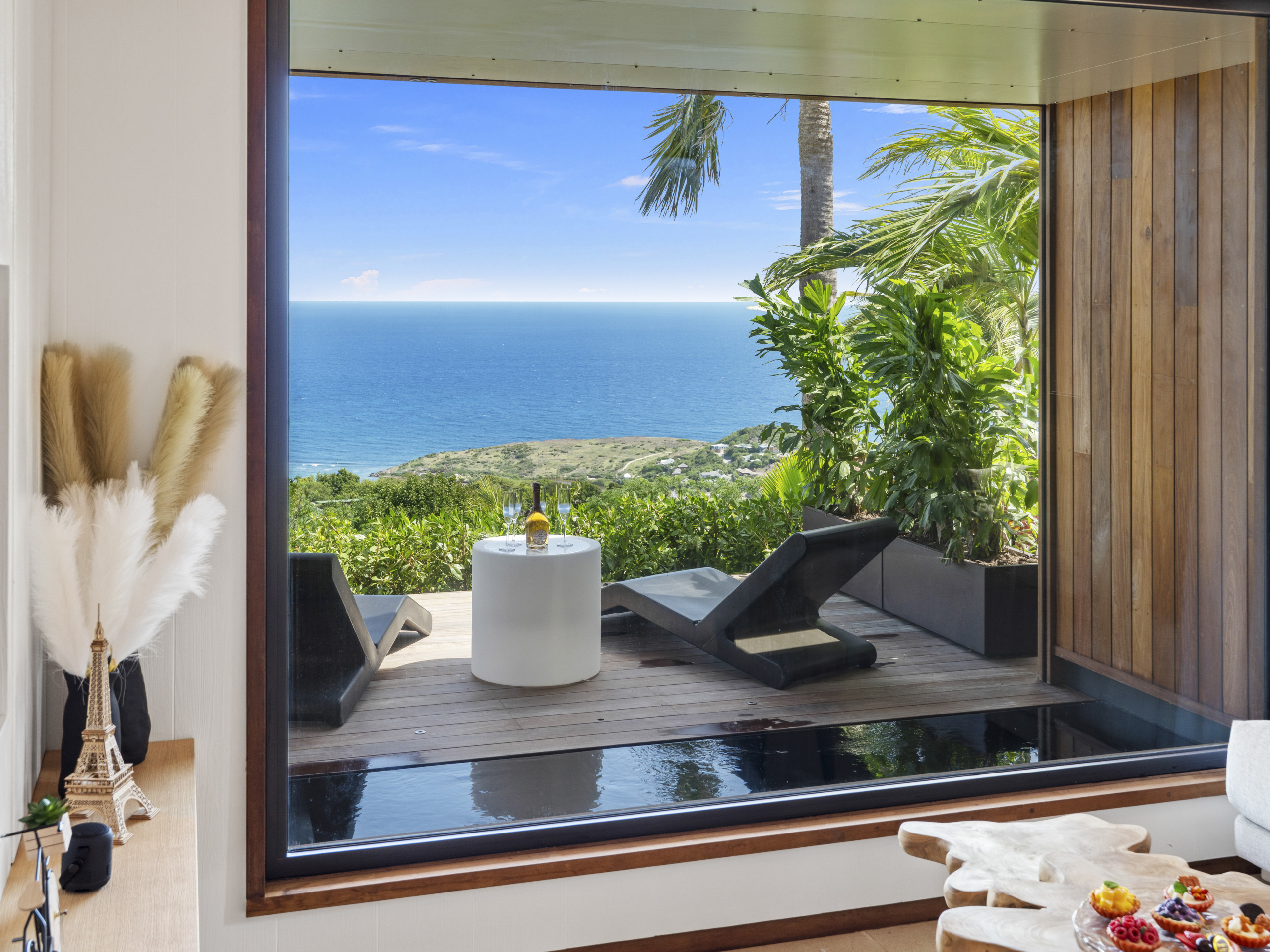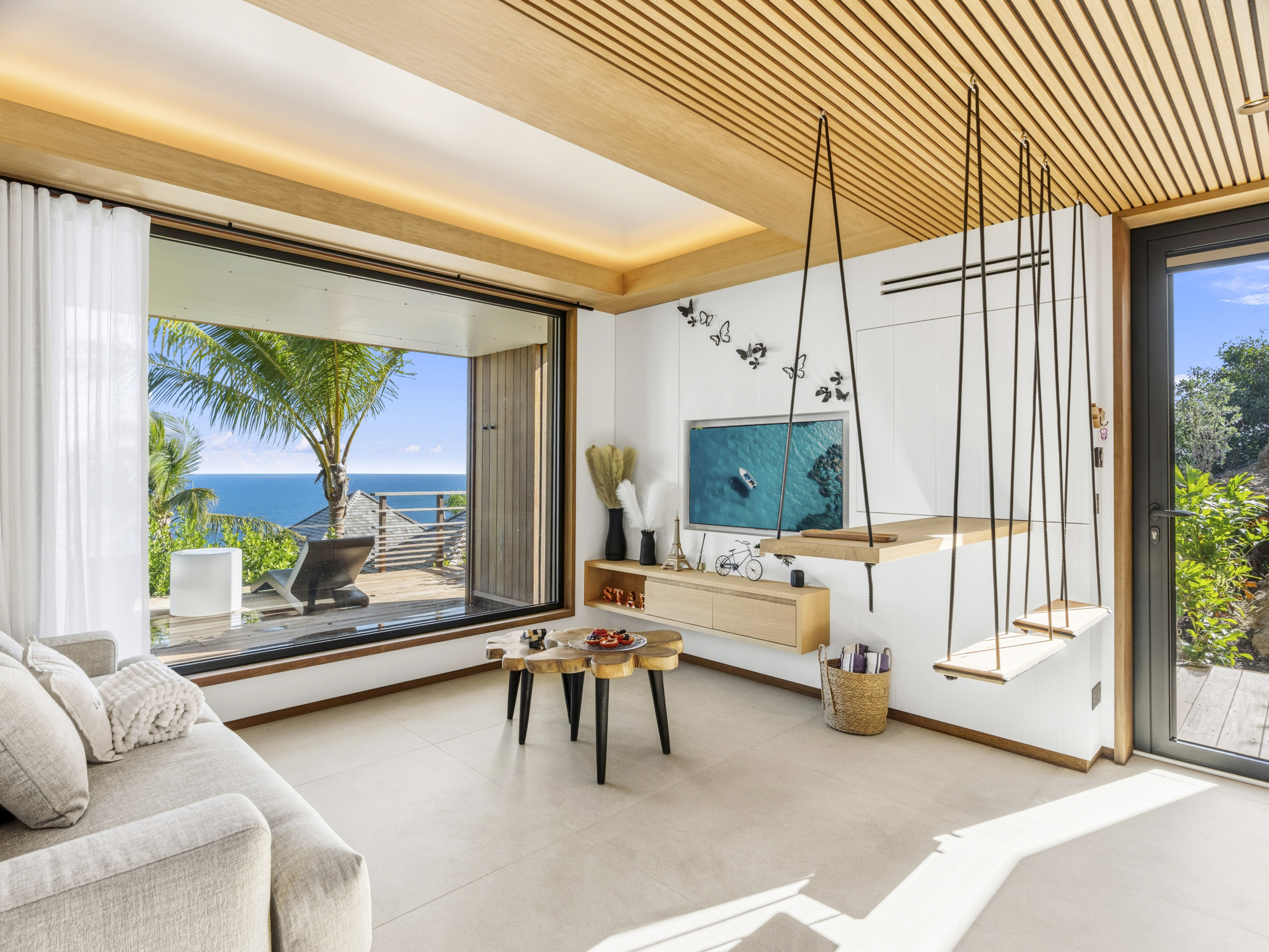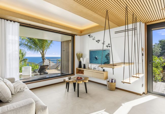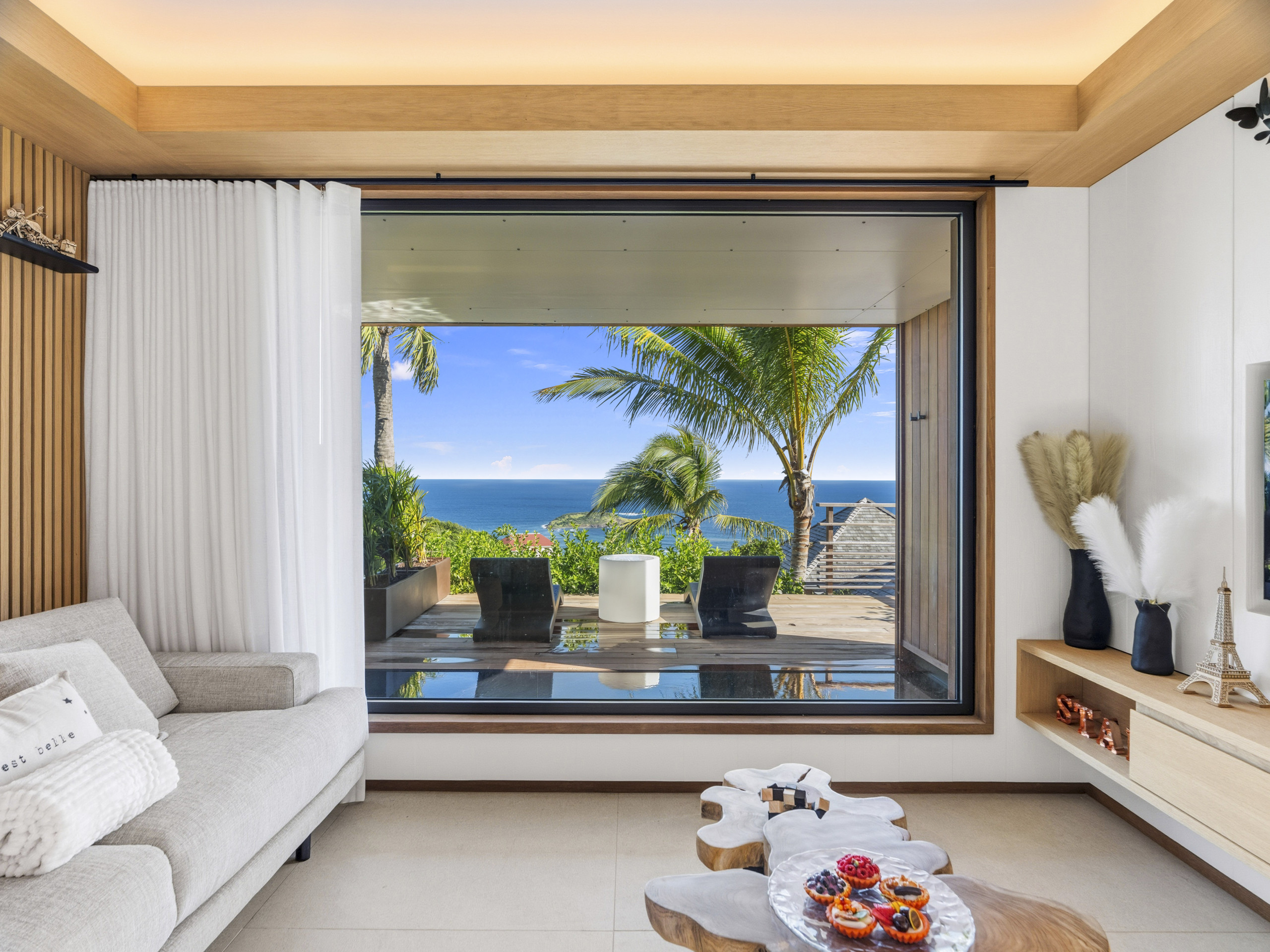 Salon lumineux ouvert sur la terrasse, baie panoramique cadrant l’océan