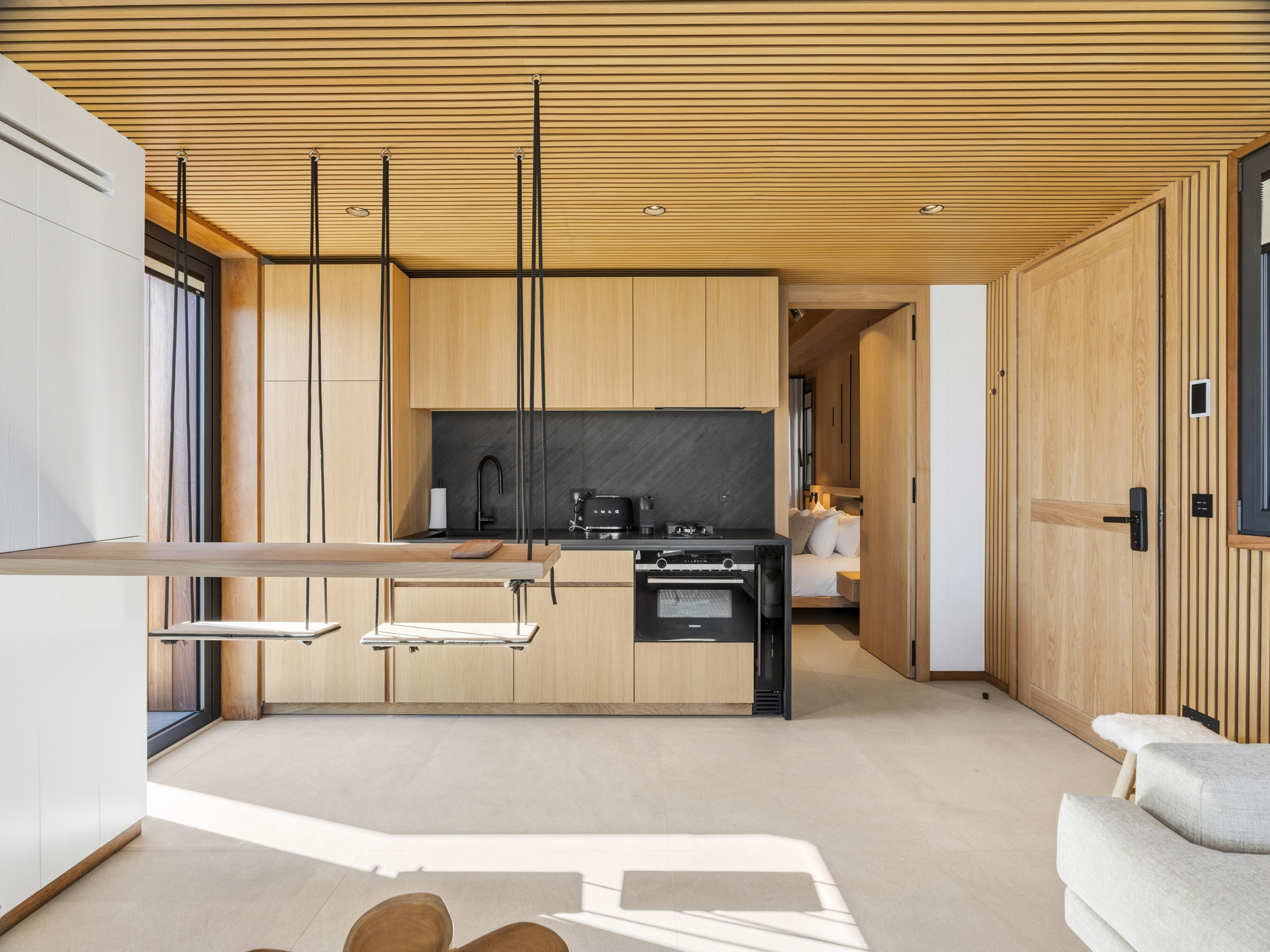 La cuisine américaine, à induction, est équipée avec réfrigérateur, micro-ondes, four, congélateur, lave-vaisselle, vaisselle/couverts, ustensiles/cuisine, cafetière et grille pain.