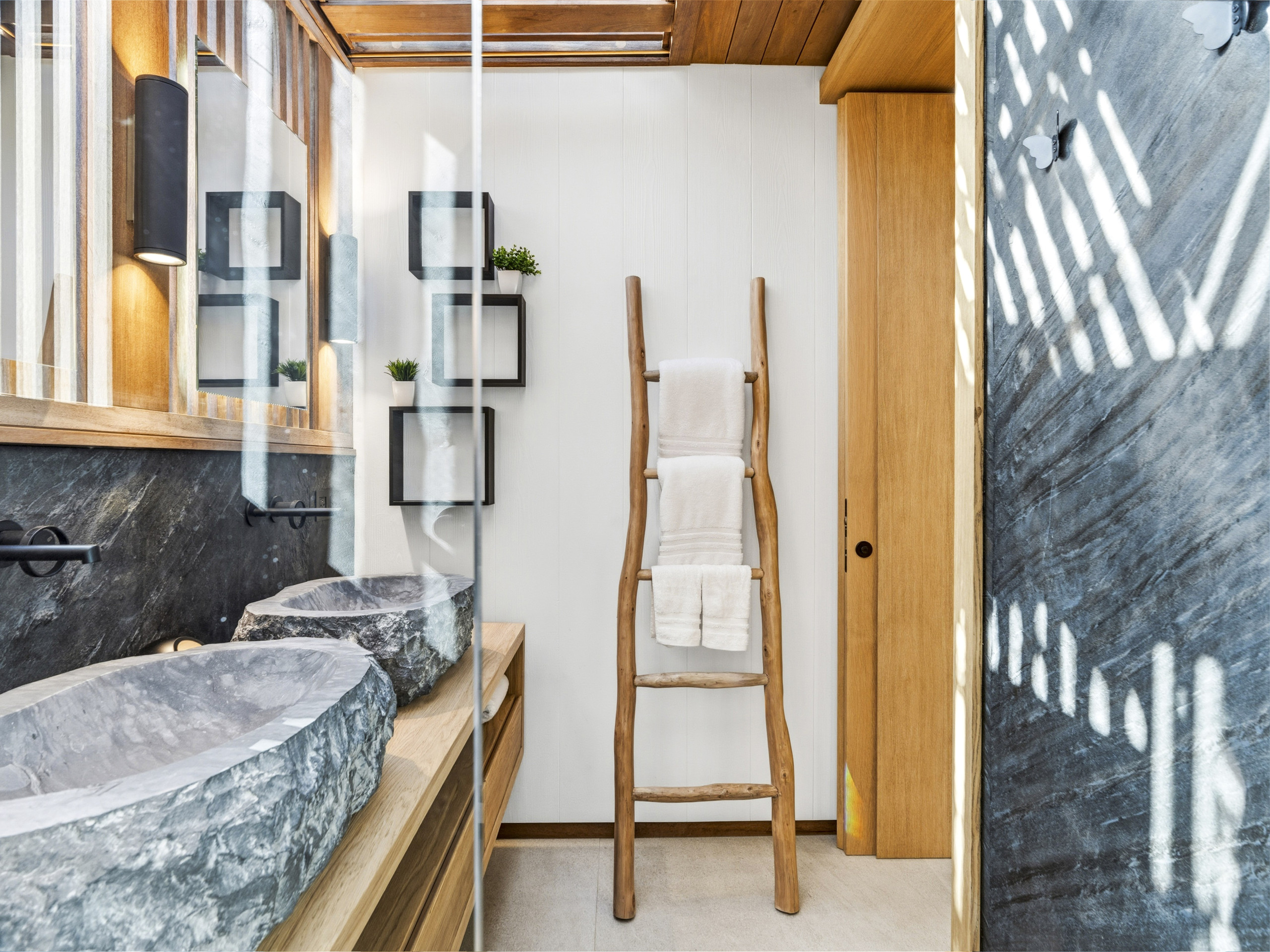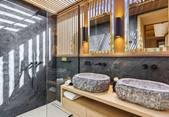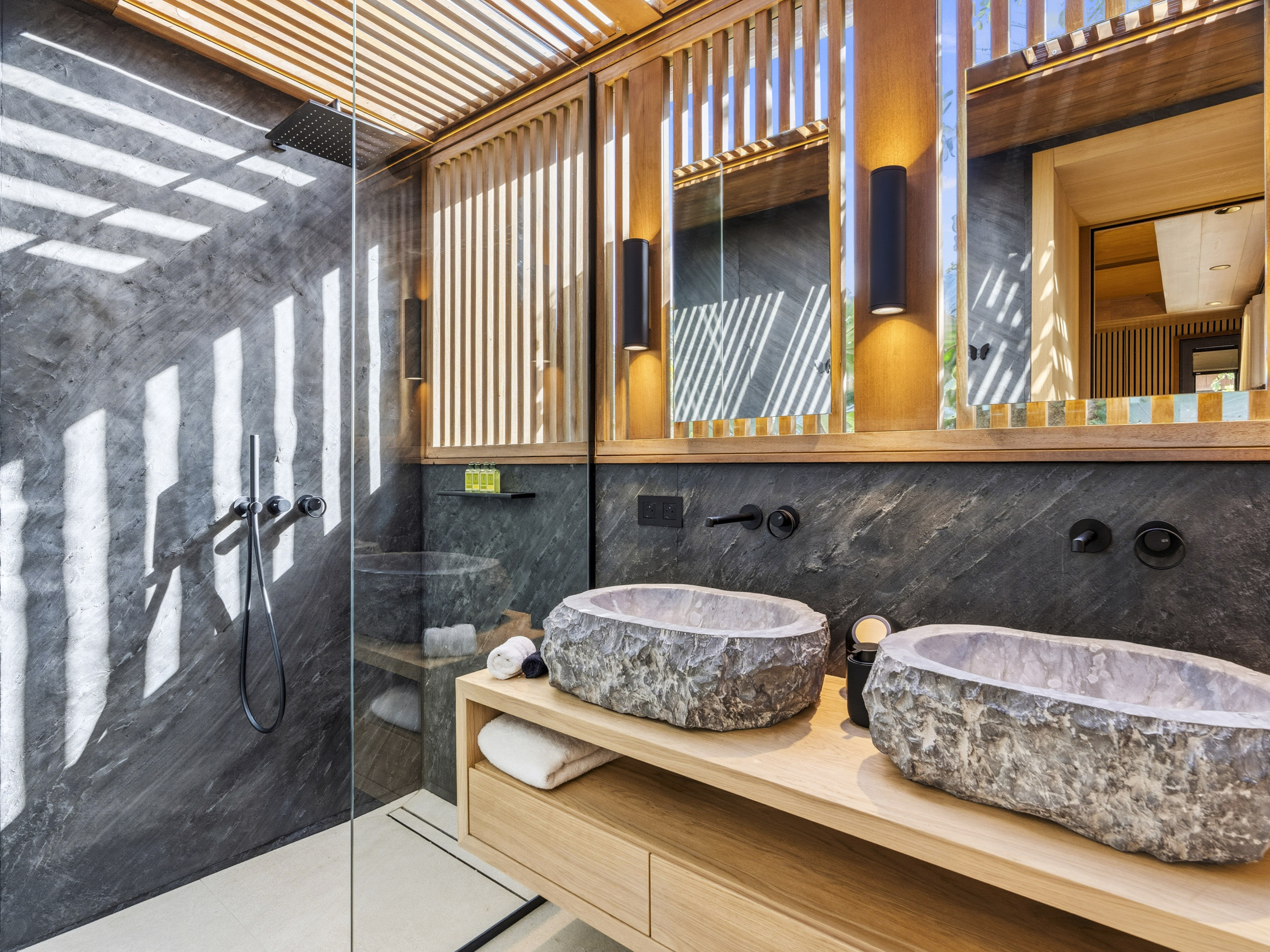 Salle de bain contemporaine (doubles vasques effet pierre, douche à l’italienne)